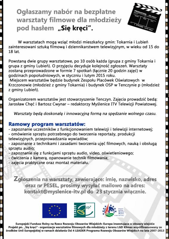 Stowarzyszenie Ten~czyn w okresie od 21.01.2015r. - 09.02.2015r. na terenie Krzczonowa i Tenczyna organizuje bezpłatne warsztaty filmowe dla młodzieży, dzięki którym młodzież może doskonalić i rozwijać swoje pasje i umiejętności.
