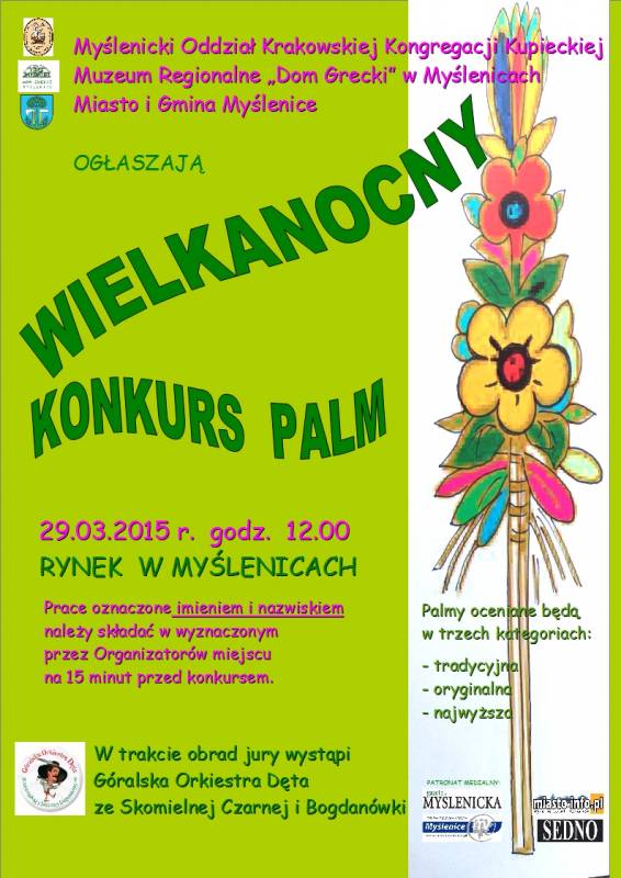 Palmy wykonane na konkurs powinny nawiązywać zarówno formą jak i surowcem do tradycyjnych palm wielkanocnych występujących dawniej na terenie powiatu myślenickiego.