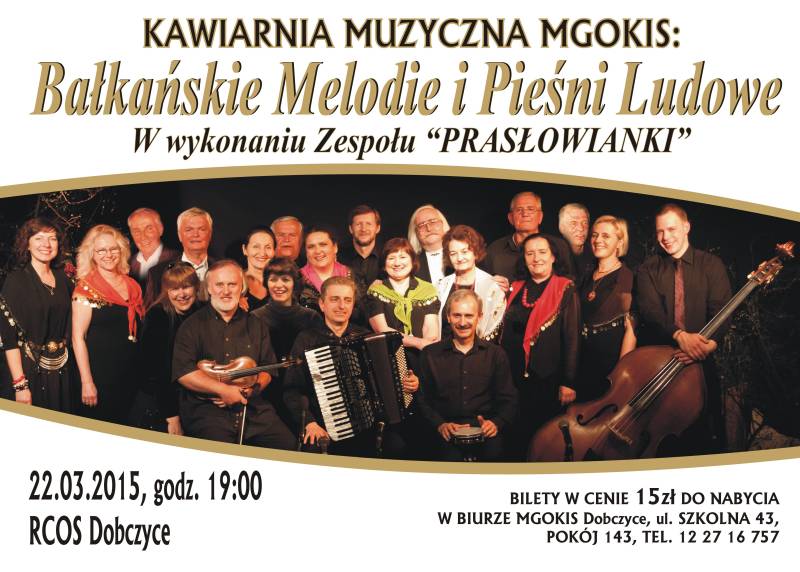 Miejsko-Gminny Ośrodek Kultury i Sportu w Dobczycach serdecznie zaprasza na XV koncert z cyklu "Kawiarnia Muzyczna MGOKiS ". Tym razem foyer Regionalnego Centrum Oświatowo-Sportowego wypełnią najpiękniejsze utwory z Bałkanów. Podczas koncertu zabierzemy Państwa w niezwykłą muzyczną podróż po Dalmacji, Macedonii, Bułgarii, Serbii, Bośni czy Chorwacji. Nie zabraknie także utworów słowiańskich. W nastrojowy klimat wprowadzi państwa Zespół "Prasłowianki"