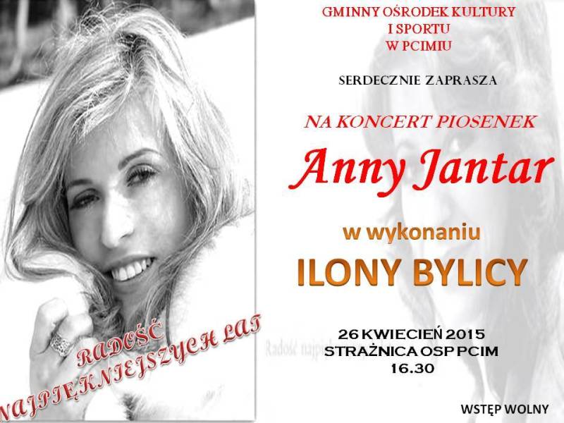 Gminny Ośrodek Sportu w Pcimiu serdecznie zaprasza na koncert piosenek Anny Jantar w wykonaniu Ilony Bylicy. Koncert odbędzie się 26 kwietnia 2015r. w Strażnicy OSP Pcim. Wstęp wolny. Zapraszamy!!!