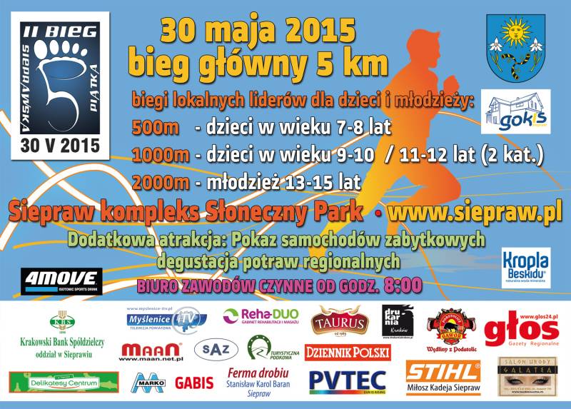 30 maja 2015 r na kompleksie Słoneczny Park w Sieprawiu odbędzie się II edycja imprezy biegowej pn. II BIEG SIEPRAWSKA PIĄTKA.