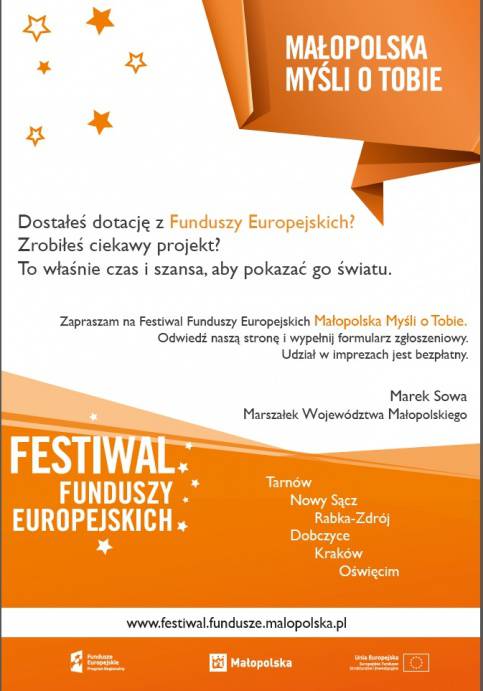Letnie imprezy plenerowe, organizowane przez Województwo Małopolskie, to doskonała okazja na zaprezentowanie dokonań związanych z Funduszami Europejskimi. Każdy z wystawców może pokazać swój oryginalny projekt, podzielić się sukcesami przedsiębiorstwa, zorganizować konkurs lub interaktywne warsztaty. Do udziału w imprezach zapraszamy małopolskich beneficjentów korzystających z dotacji unijnych w ramach Małopolskiego Regionalnego Programu Operacyjnego 2007-2013 i Programu Operacyjnego Kapitał Ludzki 2007-2013.