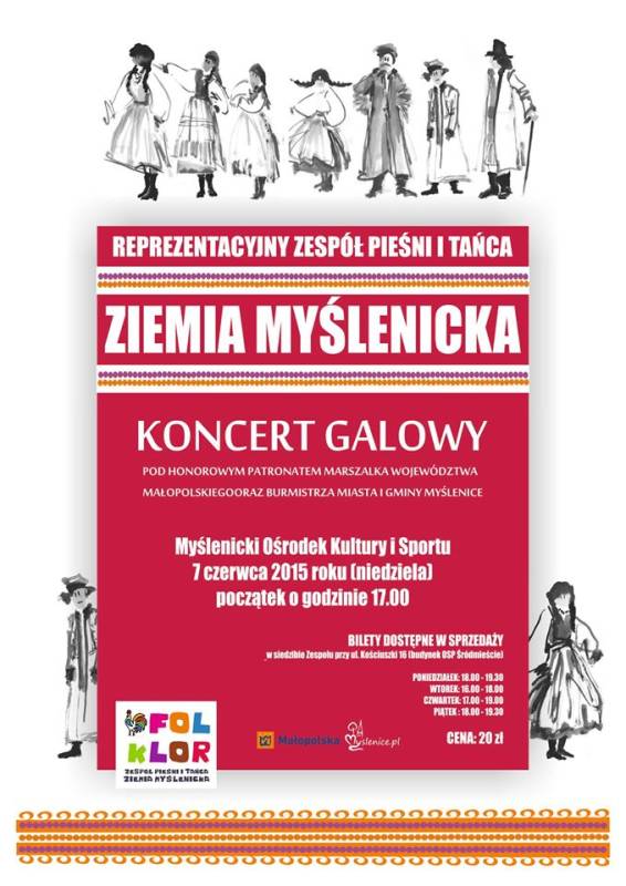 Reprezentacyjny Zespół Pieśni i Tańca "Ziemia Myślenicka" serdecznie zaprasza na czerwcowy koncert Zespołu, który odbędzie się w niedzielę 7 czerwca 2015 roku o godz. 17.00 w Myślenickim Ośrodku Kultury i Sportu.