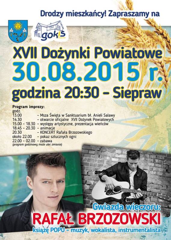 Drodzy mieszkańcy! Zapraszamy na XVII Dożynki Powiatowe, które odbędą się 30.08.2015 r. od 13:00 na Kompleksie Sportowym Słoneczny Park . Gwiazdą wieczoru będzie Rafał Brzozowski.