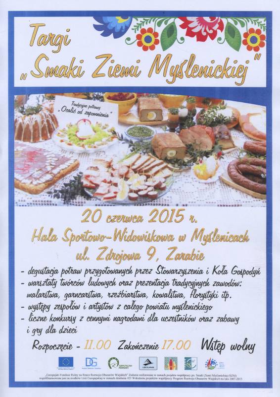 W dniu 20.06.2015 r. sobota, w Hali sportowej w Myślenicach na Zarabiu ul. Zdrojowa 9 odbędą się TARGI „Smaków Ziemi Myślenickiej”, gdzie będą zaprezentowane tradycyjne potrawy kulinarne z wszystkich miejscowości Powiatu Myślenickiego. Oprócz potraw kulinarnych będą się również prezentować twórcy i artyści naszego Powiatu, oraz zespoły folklorystyczne i artystyczne. Warto przyjść, przyjechać, wziąć udział.