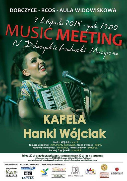 IV Dobczyckie Zaduszki Muzyczne: 7 listopada o godz. 19. zapraszamy na koncert Kapeli Hanki Wójciak. Bilety można kupić w Biurze Miejsko-Gminnego Ośrodka Kultury w Dobczycach (ul. Szkolna 43). Zapraszamy
