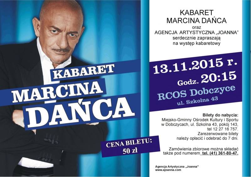 AGENCJA ARTYSTYCZNA „JOANNA” serdecznie zaprasza na występ kabaretowy Marcina Dańca, który odbędzie się 13 listopada 2015 r. w Regionalnym Centrum Oświatowo-Sportowym w Dobczycach (Ul. Szkolna 43). Start o godz. 20:15. Czas trwania programu ok .1,5 h.
