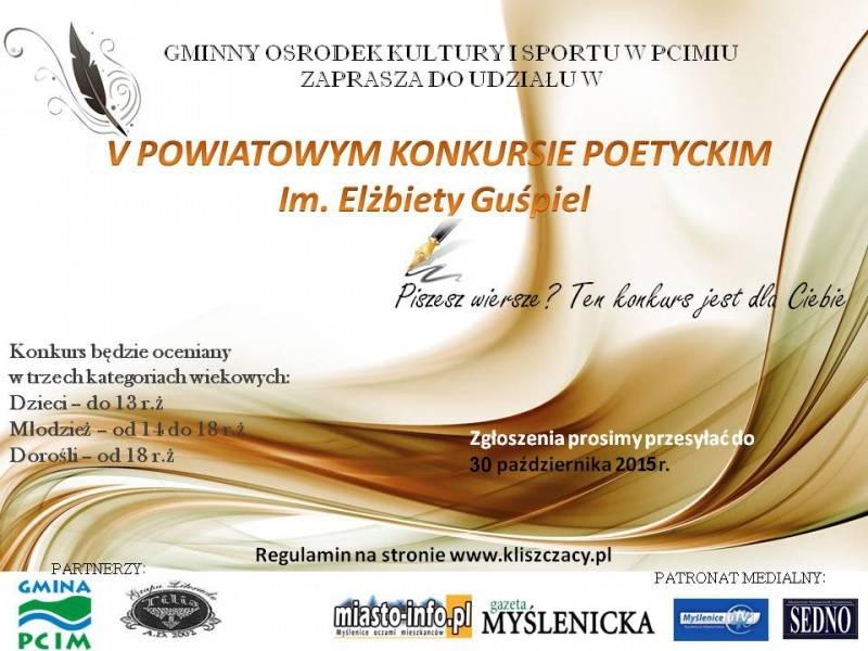 Gminny Ośrodek Kultury i Sportu w Pcimiu organizuje Powiatowy Konkurs Poetycki im. Elżbiety Guśpiel. Jeżeli piszesz wiersze ten turniej jest dla ciebie. Konkurs będzie oceniany w 3 kategoriach: dzieci do 13 lat, młodzież 14-18, dorośli powyżej 18 lat.