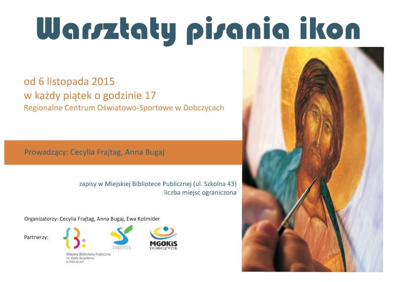 Wszystkich zainteresowanych sztuką pisania ikon serdecznie zapraszamy już od 6 listopada do Dobczyc.W każdy piątek o godzinie 17.00 w Regionalnym Centrum Oświatowo-Sportowym w Dobczycach, w salach plastycznych, będą odbywały się warsztaty plastyczne z tego zakresu. Prowadzącymi zajęcia będą Panie Cecylia Frajtag i Anna Bugaj. Zapraszamy do zapisów w  Miejskiej Bibliotece Publicznej (ul. Szkolna 43). Ilość miejsc ograniczona.
