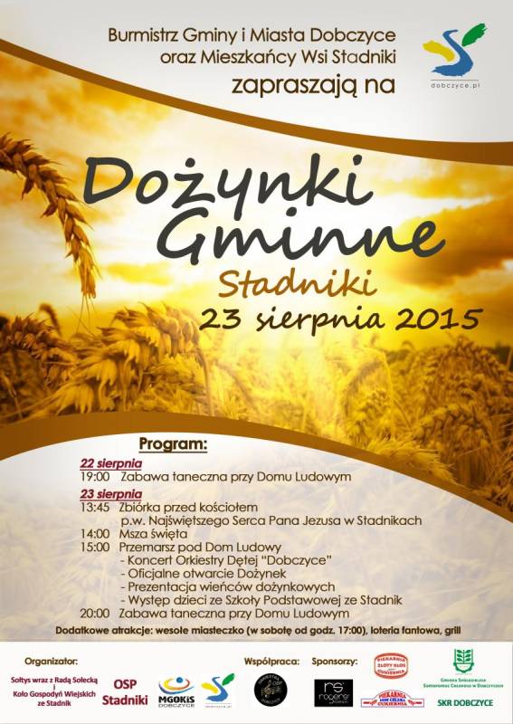 Burmistrz Gminy i Miasta Dobczyce, Dyrektor MGOKiS Dobczyce oraz mieszkańcy wsi Stadniki zapraszają na dożynki gminne, które odbędą się 23 sierpnia 2015 r. w Stadnikach. Uroczystości rozpoczną się o godzinie 14 Mszą św. w kościele p.w. Najświętszego Serca Pana Jezusa. Następnie korowód dożynkowy przejdzie pod Dom Ludowy. W programie przewidziano koncert Orkiestry Dętej "Dobczyce" i tradycyjnie prezentację wieńców dożynkowych. Wystąpią również dzieci ze Szkoły Podstawowej ze Stadnik. O 20 rozpocznie się zabawa taneczna, której przygrywać będzie na żywo zespół "Grupa Skamander" (w sobotę zabawa taneczna rozpocznie się już o 19). Dodatkowo imprezie będzie towarzyszyć loteria fantowa i wesołe miasteczko, które będzie dostępne już w sobotę od godziny 17.