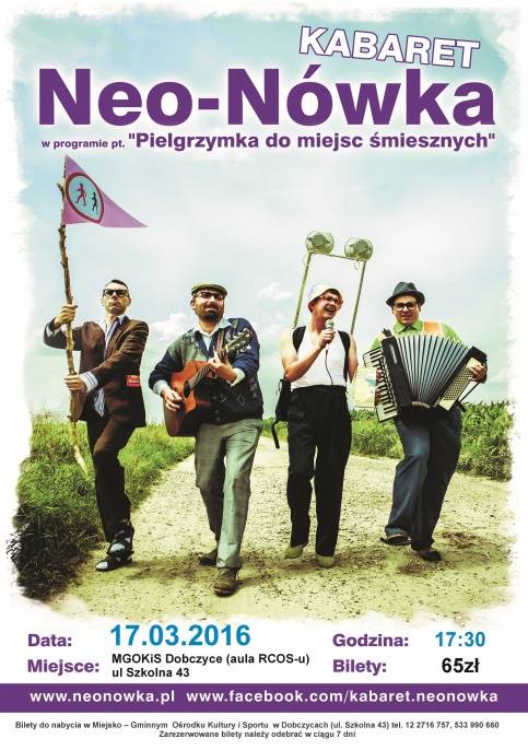 AGENCJA ARTYSTYCZNA „JOANNA" serdecznie zaprasza na występ Kabaretu Neo-Nówka pt. "Pielgrzymka do miejsc śmiesznych", który odbędzie się 17 marca 2016r. w Regionalnym Centrum Oświatowo-Sportowym w Dobczycach (Ul. Szkolna 43). Start o godz. 17:30.