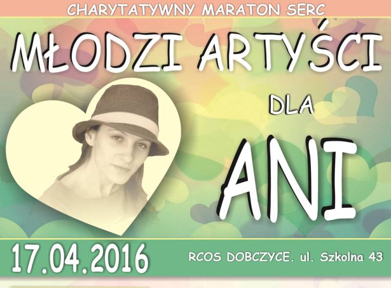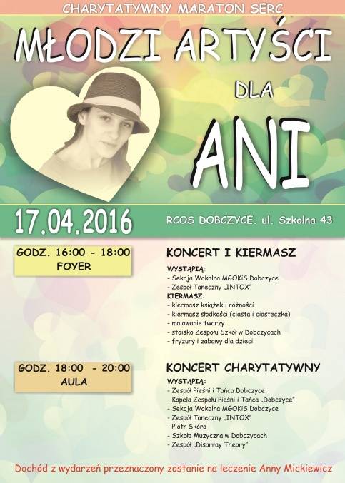Koncert: "Młodzi Artyści dla Ani" i kiermasz odbędą się już w najbliższą niedzielę, 17 kwietnia 2016 r., w Regionalnym Centrum Oświatowo-Sportowym w Dobczycach (ul. Szkolna 43).