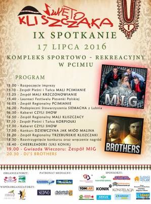 Gminny Ośrodek Kultury i Sportu w Pcimiu serdecznie zaprasza na IX Święto Kliszczaka, które odbędzie się 17 lipca na terenie Kompleksu Sportowo-Rekreacyjnego w Pcimiu. Rozpoczęcie imprezy godzina 15.00.