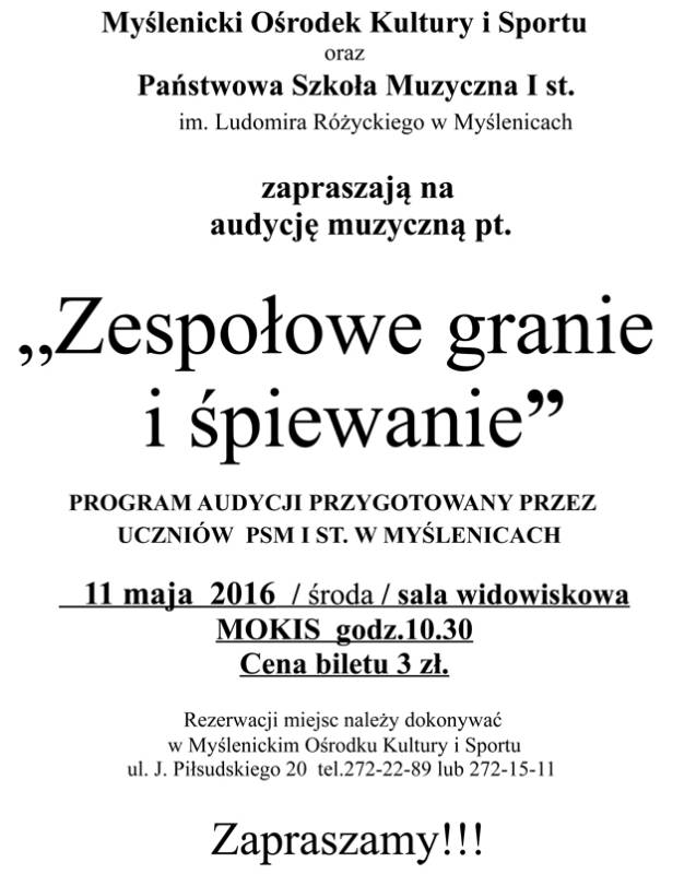 Myślenicki Ośrodek Kultury i Sportu oraz Państwowa Szkoła Muzyczna I st. im. Ludomira Różyckiego w Myślenicach zapraszają na audycję muzyczną pt. "Zespołogranie” W PROGRAMIE:
