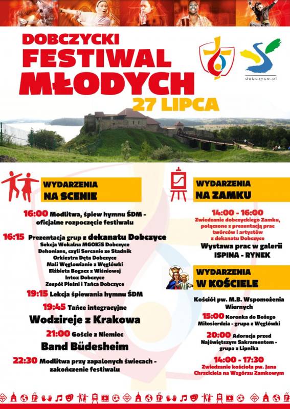 27 lipca Komitet Organizacyjny i Gmina Dobczyce zapraszają na Festiwal Młodych, który rozpocznie się o godz. 14:00 spacerem na Wzgórze Zamkowe, gdzie wystawiać się będą twórcy ludowi, a panie z Kół Gospodyń Wiejskich będą częstować regionalnymi przysmakami. O godz. 16:00 na scenie przy ul. Podgórskiej rozpoczną się koncerty, wspólne śpiewanie, modlitwa i tańce integracyjne. Gwiazdą wieczoru będzie niemiecki zespół Band Büdesheim.