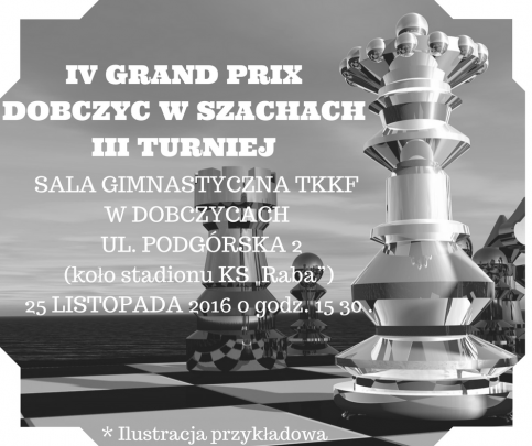 III turniej z cyklu IV Grand Prix Dobczyc w szachach odbędzie się w sali gimnastycznej TKKF w Dobczycach, przy ul. Podgórskiej 2 (koło stadionu KS „Raba”) w piątek 25 listopada 2016 r. o godz. 15:30 .