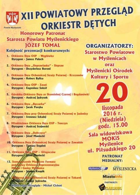 XII Powiatowy Przegląd Orkiestr Dętych odbędzie się 20 listopada 2016 r. o godzinie 15:00 na sali widowiskowej Myślenickiego Ośrodka Kultury i Sportu w Myślenicach (ul. Józefa Piłsudskiego 20).