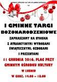 W tym roku, po raz pierwszy organizujemy Gminne Targi Bożonarodzeniowe w Lubniu. Chcielibyśmy, by stały się on możliwością zaprezentowania i sprzedaży prac przez twórców, zespoły, szkoły i inne organizacje z terenu naszej gminy i gmin ościennych. Na stoiskach prezentowane byłyby wyroby odnoszące się do Świąt Bożego Narodzenia np: stroiki, ozdoby choinkowe, kartki świąteczne, prezenty itp.