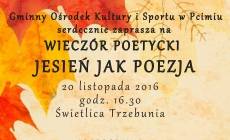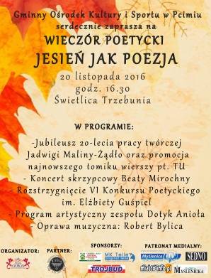 Gminny Ośrodek Kultury i Sportu w Pcimiu serdecznie zaprasza na WIECZÓR POETYCKI Jesień jak poezja, który odbędzie się 20 listopada o godzinie 16.30 - Świetlica Trzebunia działającej przy GOKiS Pcim.