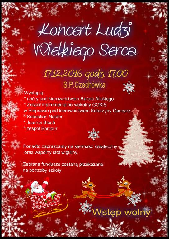 Szkoła Podstawowa w Czechówce serdecznie zaprasza na Koncert Ludzi Wielkiego Serca, który odbędzie się w dniu 17 grudnia br. o godzinie 17.00 w Szkole Podstawowej w Czechówce.