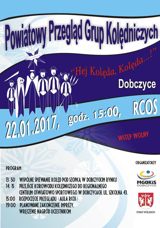 Miejsko-Gminny Ośrodek Kultury i Sportu w Dobczycach oraz Starostwo Powiatowe w Myślenicach serdecznie zapraszają dziecięce, młodzieżowe i dorosłe grupy kolędnicze działające na terenie powiatu myślenickiego, prezentujące autentyczne formy kolędowania charakterystyczne dla regionu, z którego się wywodzą, do udziału w Powiatowym Przeglądzie Grup Kolędniczych „Hej Kolęda, Kolęda..!.”.