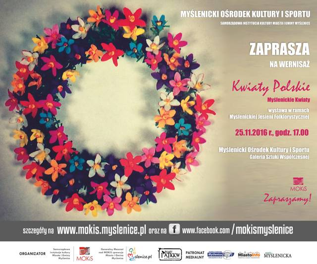 Myślenicki Ośrodek Kultury i Sportu zaprasza serdecznie na wernisaż wystawy „Kwiaty Polskie. Myślenickie kwiaty”, który odbędzie się 25 listopada (piątek) o godz. 17.00 w Myślenickim Ośrodku Kultury i Sportu. Na wystawie zaprezentowane zostaną tradycyjne ozdoby bibułkowe przygotowane przez 9 twórców z Wiśniowej, Skomielnej Czarnej, Tokarni i Wierzbanowej.