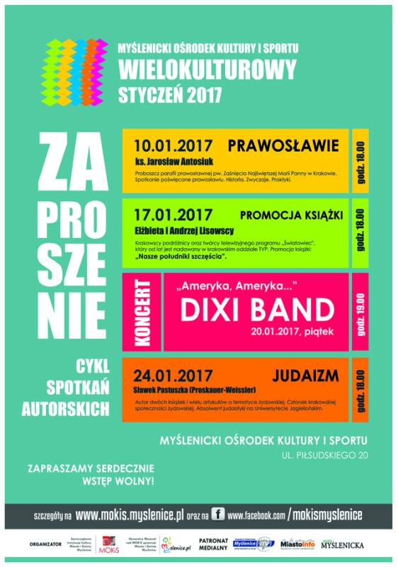 Myślenicki Ośrodek Kultury i Sportu zaprasza serdecznie na cykl spotkań autorskich w ramach programu „Wielokulturowy styczeń w MOKiS”. Specjalnie dla mieszkańców Myślenic zaproszono wyjątkowych gości, którzy podzielą się swoimi doświadczeniami i wiedzą m.in. z zakresu tradycji i zwyczajów prawosławia i judaizmu. W ramach koncertu „Ameryka, Ameryka…” zagra także Zespół Dixi Band. O swojej najnowszej książce „Południki szczęścia” opowiadać będą Elżbieta i Andrzej Lisowscy.