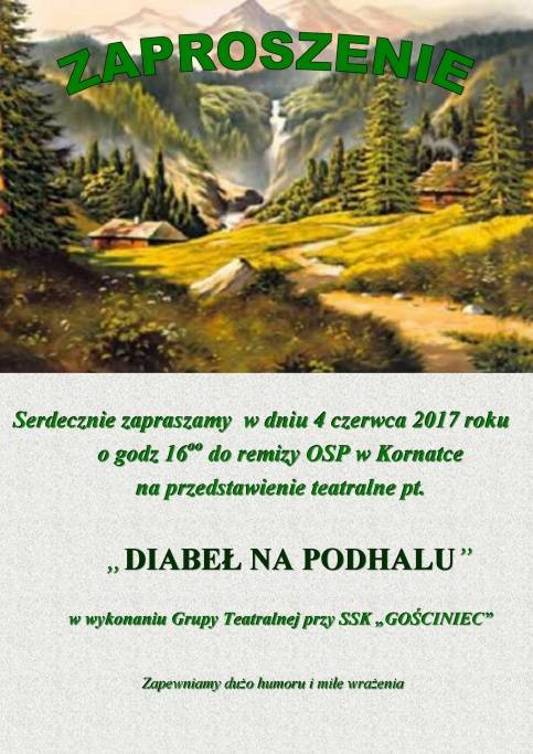 Amatorska Grupa Teatralna, działająca przy Stowarzyszeniu Gościniec w Kornatce, zaprasza na przedstawienie