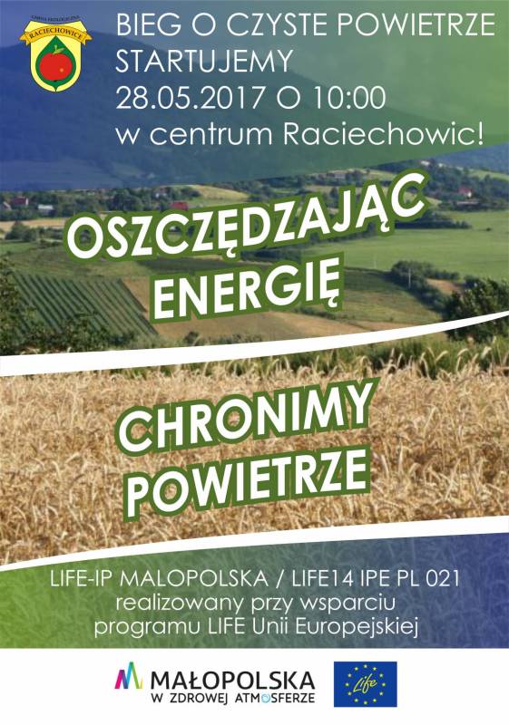 Serdecznie zapraszamy na Bieg O Czyste Powietrze, realizowany przy wsparciu programu LIFE Unii Europoejskiej. Bieg wystartuje z centrum Raciechowic 28 maja o godzinie 10.Źródło: http://raciechowice.pl/2017/05/bieg-o-czyste-powietrze/