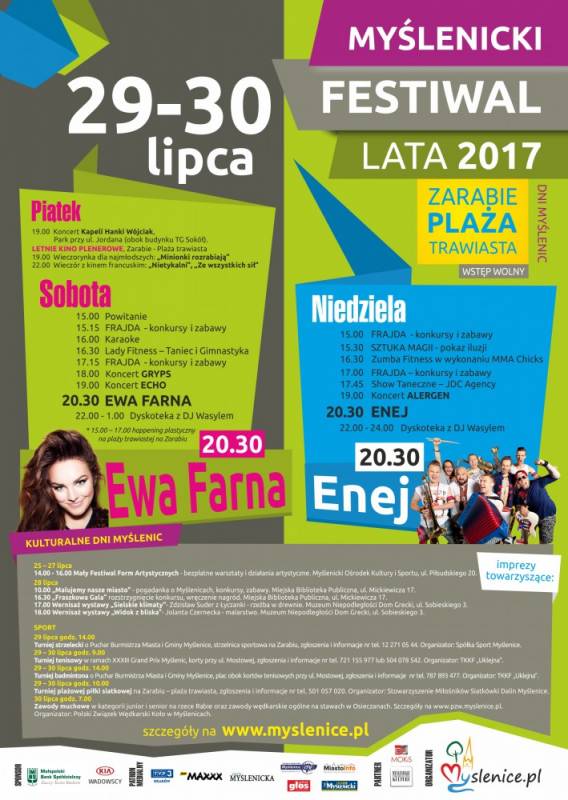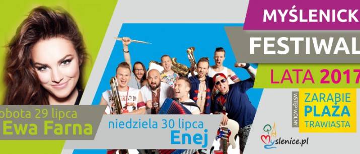 W ostatni weekend lipca zapraszamy na Myślenicki Festiwal Lata - Dni Myślenic 2017. Głównymi gwiazdami imprezy plenerowej będą Ewa Farna oraz Enej. Więcej informacji o programie imprezy na: www.myslenice.pl/program-na-myslenicki-festiwal-lata-2017,art-202