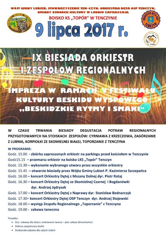 Zapraszamy na V Festiwal Kultury Beskidu Wyspowego „Beskidzkie Rytmy i Smaki” - Biesiada Orkiestr Dętych.Źródło: www.lubien.pl