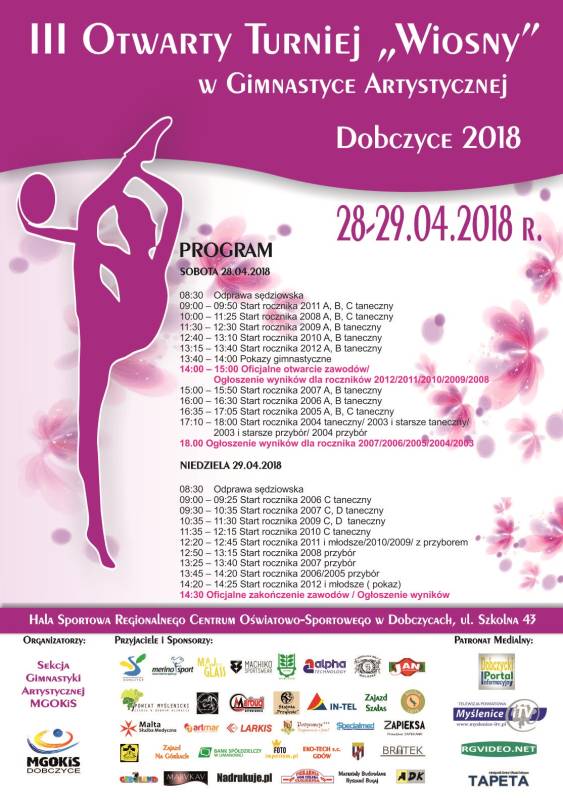 Sekcja Gimnastyki Artystycznej działająca przy MGOKiS oraz Miejsko-Gminny Ośrodek Kultury i Sportu w Dobczycach serdecznie zapraszają na jedno z najbardziej widowiskowych wydarzeń sportowych - Otwarty Turniej Wiosny w Gimnastyce Artystycznej. Już po raz III, najlepsze gimnastyczki z Małopolski będą rywalizować w Dobczycach, o miejsca na podium.