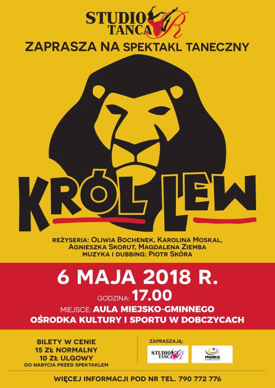 Studio Tańca "R" zaprasza na spektakl taneczny "Król Lew", który odbędzie się 6 maja o 17:00 w auli Miejsko-Gminnego Ośrodka Kultury i Sportu w Dobczycach.