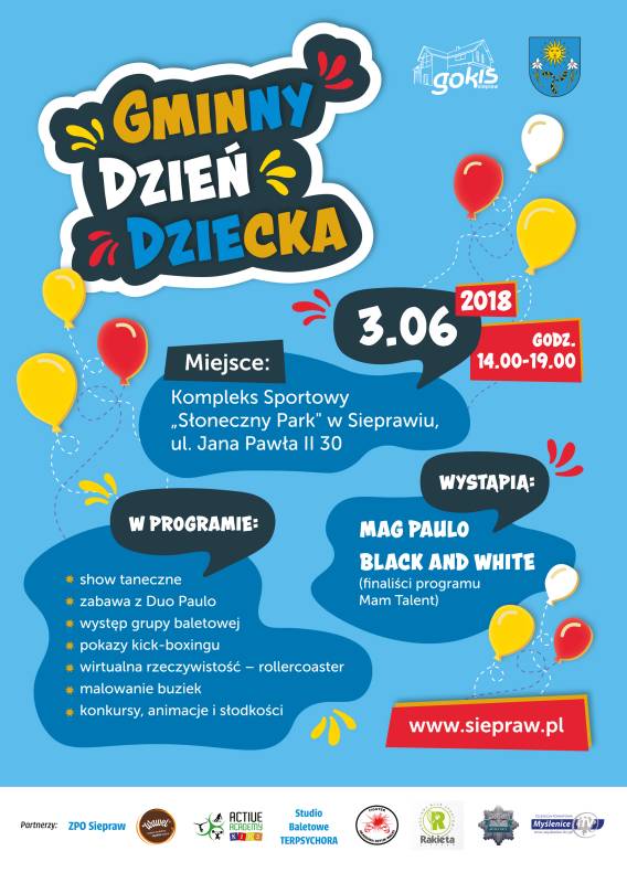 Serdecznie zapraszamy na Gminny Dzień Dziecka, który odbędzie się 3 czerwca br. w godzinach od 14.00 do 19.00 na Kompleksie Sportowym "Słoneczny Park" w Sieprawiu (ul. Jana Pawła II 30).