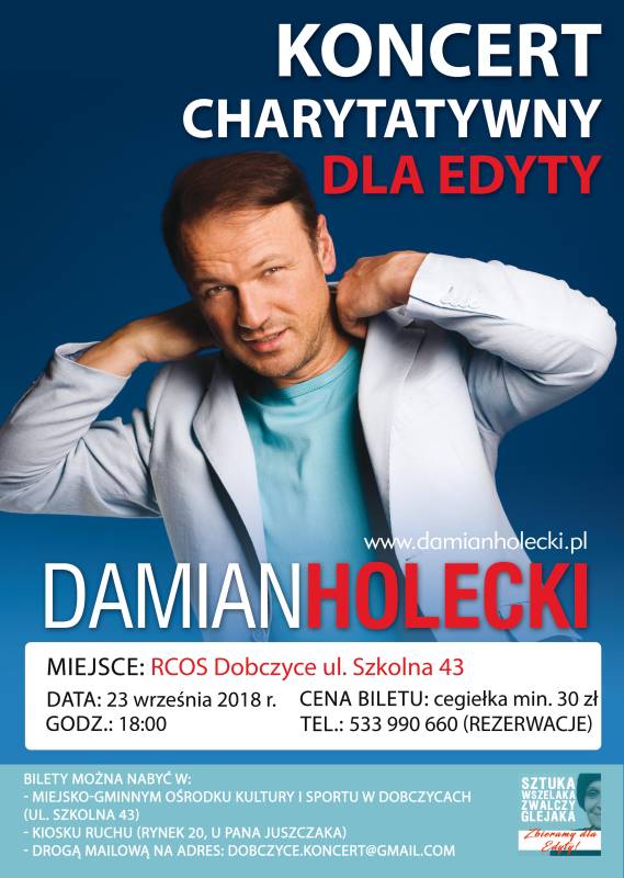 Komitet Społeczny "Sztuka wszelaka zwalczy glejaka - zbieramy dla Edyty" zaprasza na koncert charytatywny Damiana Holeckiego, który odbędzie się 23 września 2018 roku, o godz. 18:00, w Regionalnym Centrum Oświatowo-Sportowym w Dobczycach (ul. Szkolna 43).