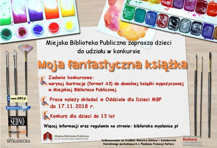 W ramach projektu „Nasza Fantastyczna Biblioteka” Oddział dla Dzieci Miejskiej Biblioteki Publicznej im. ks. Jana Kruczka w Myślenicach zachęca do udziału w konkursie dla dzieci "Moja fantastyczna książka ". Zadanie konkursowe polega na narysowaniu ilustracji do dowolnej książki wypożyczonej w Miejskiej Bibliotece Publicznej. Konkurs trwa od 4.10.2018 r. do 17.11.2018 r.