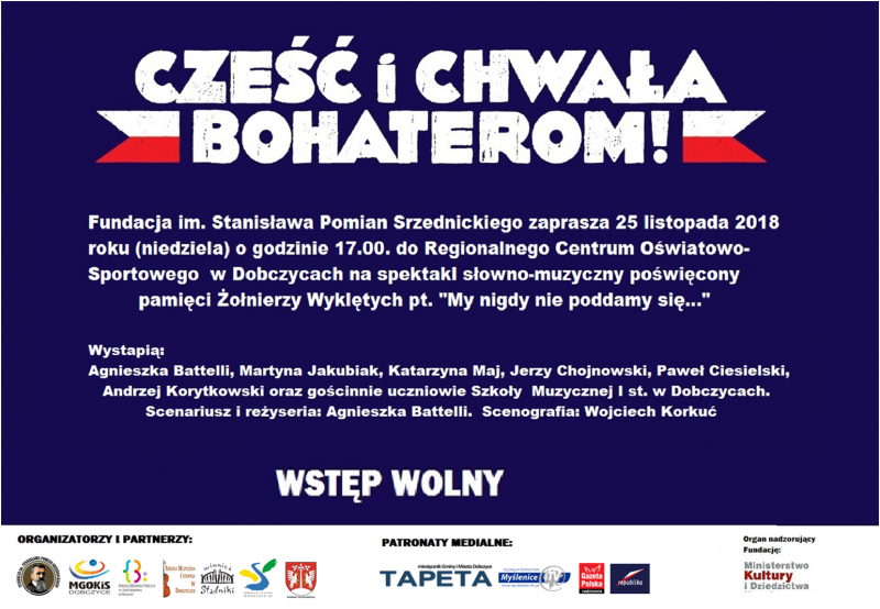 Fundacja im. Stanisława Pomian-Srzednickiego zaprasza w niedzielę 25 listopada 2018 roku o godz. 17.00 do Regionalnego Centrum Oświatowo-Sportowego w Dobczycach na spektakl słowno-muzyczny poświęcony pamięci Żołnierzy Wyklętych pt. „My nigdy nie poddamy się…”. Inspiracją spektaklu była m.in. postać księdza Stefana Muniaka z Dziekanowic i jego niezłomna postawa wynikająca z miłości bliźniego. Ks. Muniak został skazany na karę 7 lat więzienia za udzielenie w roku 1948 ślubu Celinie Drozdowicz i Franciszkowi Mrozowi.