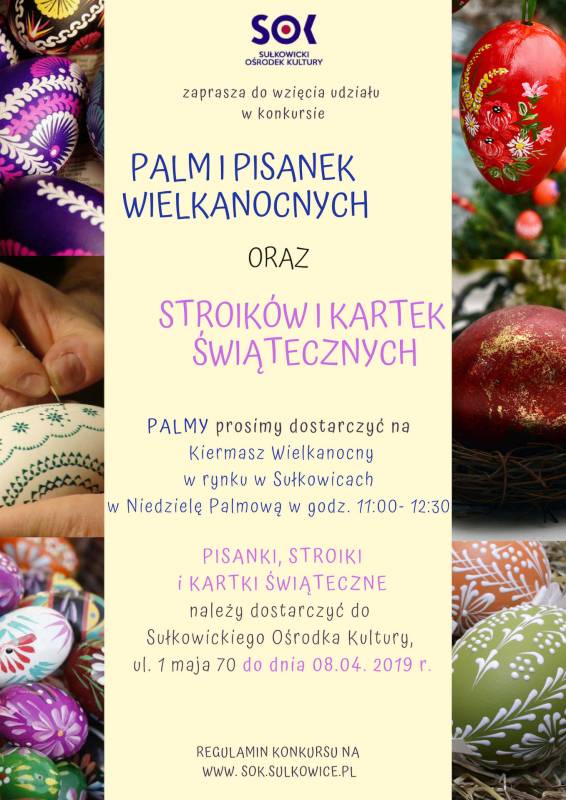 Sułkowicki Ośrodek Kultury serdecznie zachęca do wzięcia udziału w Gminnym Konkursie Palm, Pisanek, Stroików i Kartek Wielkanocnych 2019.