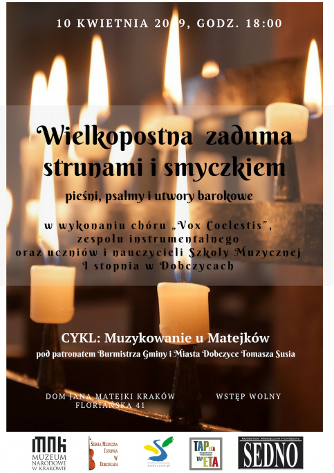 Pieni, pslamy i utwory barokowe wykonane będą prze chór "Vox Coelestis" oraz uczniów i nauczycieli Szkoły Muzycznej I Stopnia z Dobczyc w Domu Jana Matejki w Krakowie, ul. Floriańska 41.