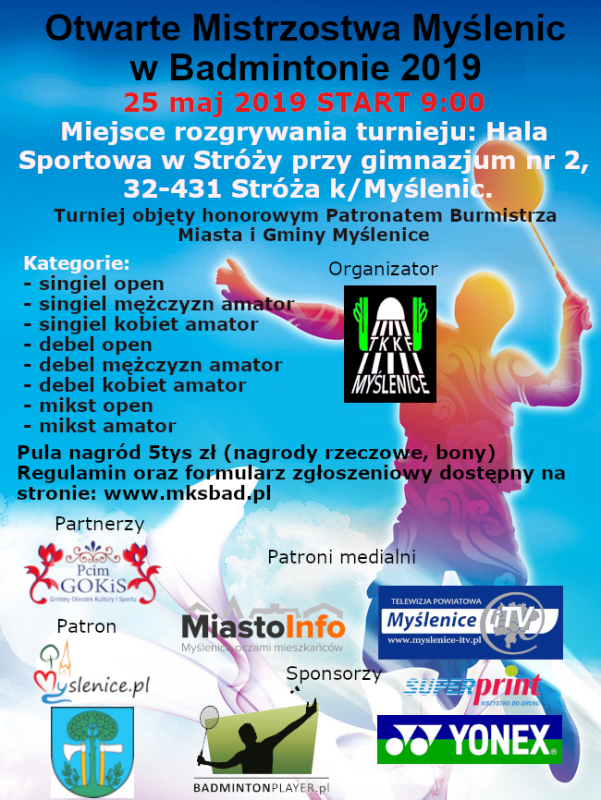 TKKF UKLEJNA Myślenice zaprasza na Otwarte Mistrzostwa Myślenic w Badmintona - edycja 2019 Turniej zostanie rozegrany 25 maja 2019 (sobota) w Gimnazjum Nr 2 w Stróży Start godz. 9:00 Kibice wstęp wolny!!! Zapraszamy do wspólnego kibicowania, a chętnych do zapisów oraz czynnego uczestnictwa w zawodach. Szczegóły na stronie www.mksbad.pl