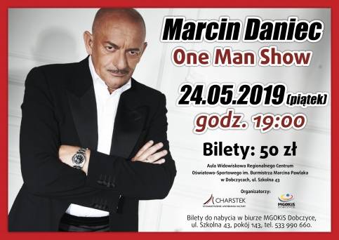 Stowarzyszenie Wspierania Kultury Charstek oraz Miejsko – Gminny Ośrodek Kultury i Sportu w Dobczycach zapraszają na występ Marcina Dańca „One Man Show”, który odbędzie się 24 maja 2019r. (piątek) o godz. 19:00 w auli widowiskowej Regionalnego Centrum Oświatowo – Sportowego im Burmistrza Marcina Pawlaka w Dobczycach.