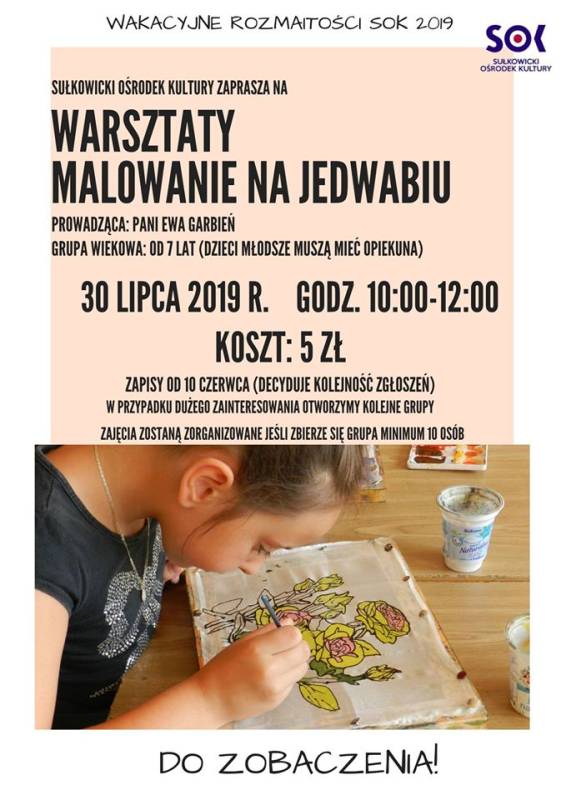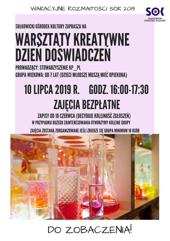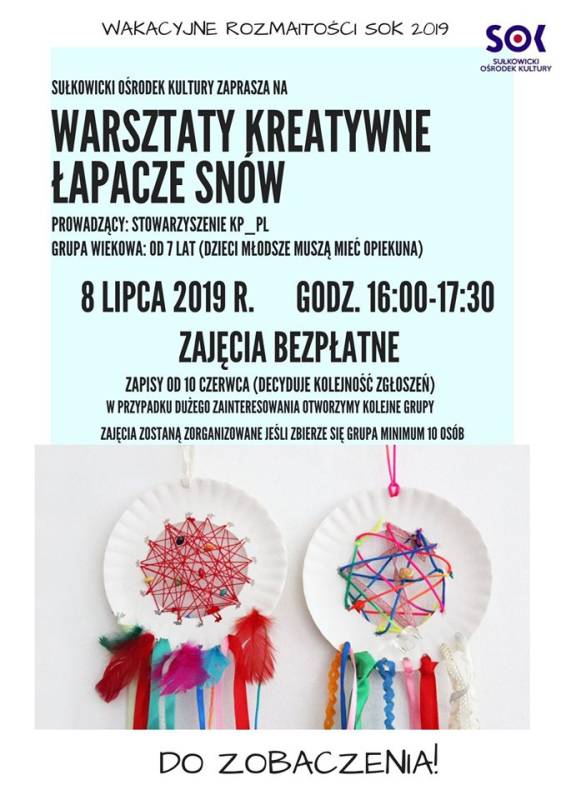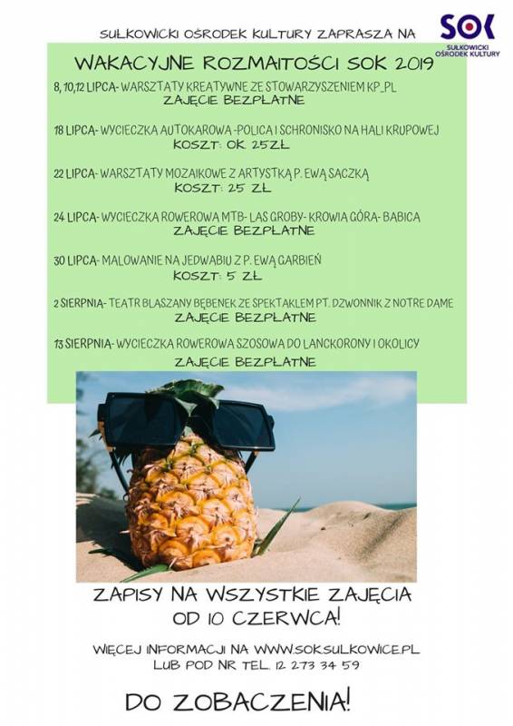 Czas wakacji to okres zabawy oraz wypoczynku dla dzieci i młodzieży. Wychodząc naprzeciw oczekiwaniom Sułkowicki Ośrodek Kultury przygotował ciekawą ofertę warsztatów i wycieczek. Poniżej przedstawiamy harmonogram (Plakaty poszczególnych wydarzeń umieszczone są w galerii):