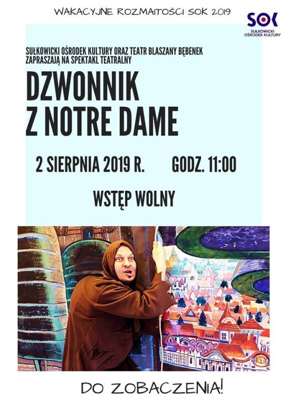 Spektakl dla widzów w każdym wieku. W przystępny i zabawny sposób zostanie przedstawiona historia znanego dzwonnika i jego wielkiej miłości. Spektakl odbędzie się o godz. 11:00. Wstęp bezpłatny.