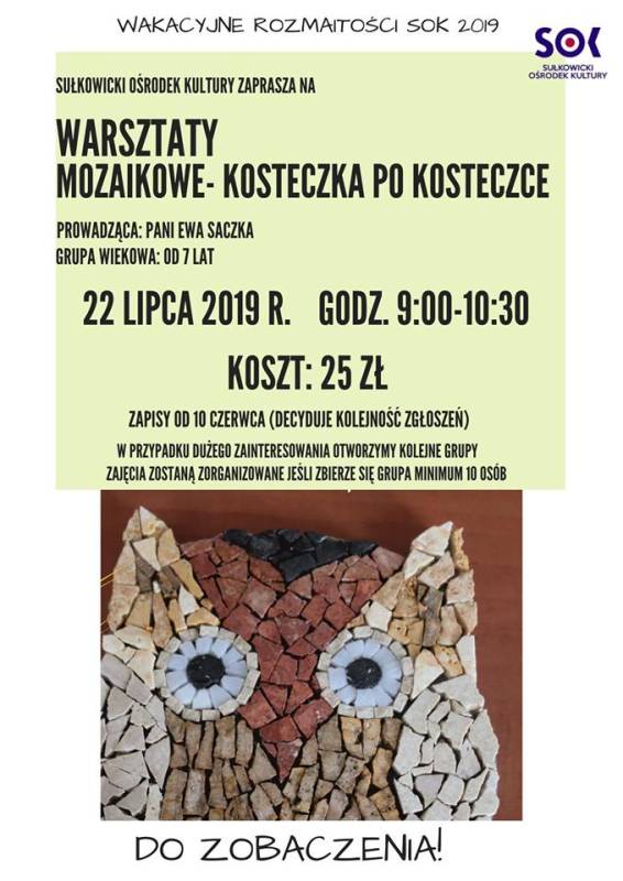 Pierwszy raz w Sułkowicach zagości artystka, twórczyni wspaniałych mozaiek p. Ewa Saczka. Warsztaty, po których dzieci zabiorą własnoręcznie wykonane dzieła do domu, odbędą się w godz. 9:00-10:30. Koszt zajęć to 25 zł/os. Zajęcia odbędą się jeżeli zbierze się grupa min. 10 osób. (w razie dużego zainteresowania powstanie grupa dodatkowa)