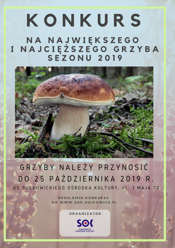Kolejną formą spędzania wakacji z Sułkowickim Ośrodkiem Kultury będzie organizowany przez nas „Konkurs na Największego i Najcięższego Grzyba sezonu 2019”.