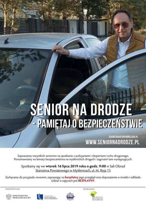 We wtorek 16 lipca 2019r. w Starostwie Powiatu Myślenickiego (ul. M. Reja 13), w godzinach 9:00-11:00 na sali obrad Starostwa ,odbędzie się spotkanie z seniorami powiatu myślenickiego w celu uświadomienia kierowców, rowerzystów i pieszych 60+ jak bezpiecznie i prawidłowo poruszać się po jezdni.
