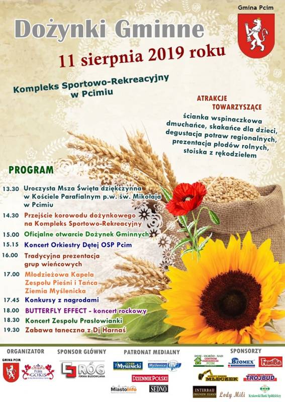 Już w niedzielę 11 sierpnia 2019r., na Kompleksie Sportowo – Rekreacyjnym w Pcimiu, odbędą się dożynki gminne.