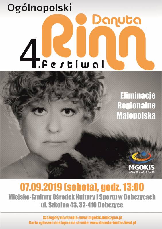 Miejsko-Gminny Ośrodek Kultury i Sportu w Dobczycach zaprasza na Eliminacje Regionalne 4 Danuta Rinn Festiwal. Hasłem przewodnim tegorocznego festiwalu jest „Czas relaksu”. Bohaterem tegorocznej edycji Festiwalu jest Andrzej Rybiński i jego piosenki. Eliminacje odbędą się 07 września 2019 r. w Miejsko-Gminnym Ośrodku Kultury i Sportu w Dobczycach (ul. Szkolna 43). Mogą wziąć w nich udział mieszkańcy Małopolski i sąsiadujących województw (podkarpackie, śląskie, świętokrzyskie). Uczestnicy biorący udział w Eliminacjach Regionalnych zobowiązani są do wypełnienia kart zgłoszeń online, dostępnych na stronie: https://danutarinnfestiwal.pl/2019/06/19/formularz-zgloszeniowy/ , w terminie do 04.09.2019 roku. Limit miejsc ograniczony. Każda osoba biorąca udział w Festiwalu przygotowuje 2 piosenki w języku polskim, w tym jedną z repertuaru Danuty Rinn lub Andrzeja Rybińskiego.
