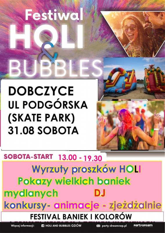 W sobotę (31 sierpnia 2019 r.) na ul. Podgórskiej w Dobczycach (Skate Park) odbędzie się Festiwal HOLI & BUBBLES!