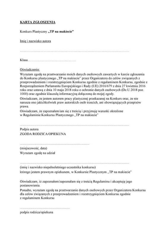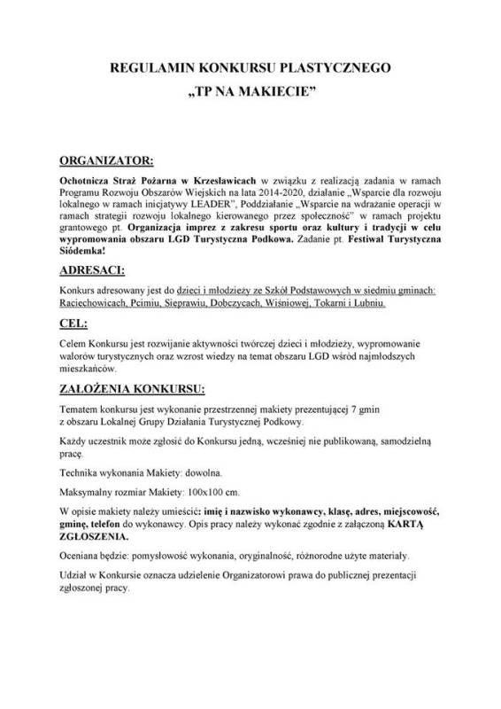 Zachęcamy do zapoznania się z regulaminem konkursu plastycznego "TP NA MAKIECIE" realizowanego w ramach Festiwalu. Konkurs przeznaczony jest dla uczniów szkół podstawowych z terenu 7 gmin zrzeszających Lokalną Grupę Działania Turystyczna Podkowa.